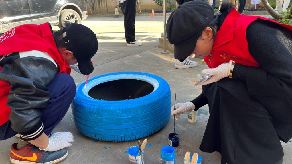 志愿者们先与村委会负责人共同举行了庭院美化会议,就具体的装饰方案和细节问题进行了深入讨论。随后根据分组,部分志愿者承担起搜集旧轮胎和瓦片的任务,他们将这些材料清洗并加工。与此同时,其他志愿者在社区内寻找适宜进行装饰的地点,并进行详细的设计和布置工作。