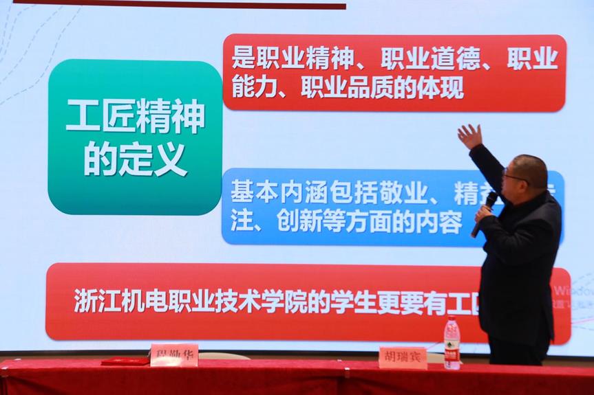 最后,举行浙江机电职业技术学院“胡瑞宾客座教授聘任仪式”,并由程勤华书记代表学院为胡瑞宾先生颁发客座教授聘书。程书记对胡瑞宾学长受聘学院客座教授表示欢迎和感谢,他表示作为多家企业的总经理和董事长,能如此关心关注职业教育,重视创新创业工作是非常难能可贵的,希望日后能把校友企业建设成联系紧密的校企合作关系,期待胡教授能常回母校指导学弟学妹开展创新创业活动,充分发挥客座教授功能和价值,尤其是胡教授作为省内创新创业专业评委,也希望接下来能助力学院挑战杯和互联网+等创新创业类大赛,争取更大突破。