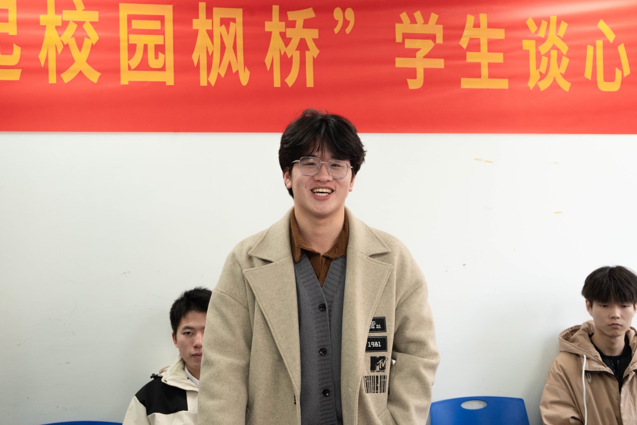 “期末临近,课程较多,课程进度快,是否可以安排同专业中基础薄弱的同学开展互助学习组,进行交流学习。”“寝室目前热水开放时间段只有早晨和晚上,是否可以设置中午这个时间段开放热水以供使用?”“我校高度重视学生科研创新能力的培养,但目前同学参与竞赛的热情不足,如何调动同学的参赛积极性与主动性呢?”这是谈心会上,朱书记与学生们面对面,学生们畅所欲言,谈学习、谈生活、提意见、提建议。