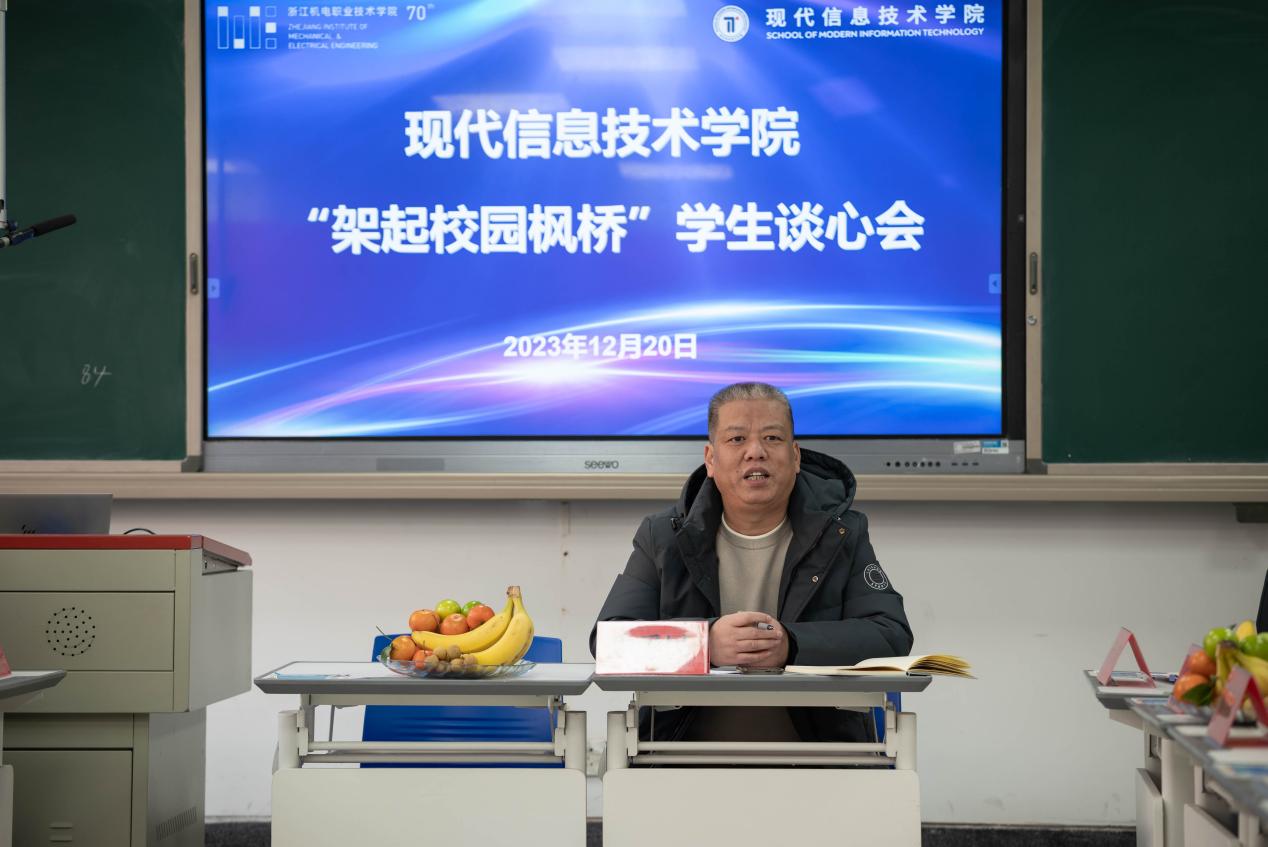 为进一步做好学生教育管理工作,了解学生思想动态和学习生活状况,解决学生反馈的学习、生活中遇到的问题,助力学生成长,促进学校高质量发展,12月20日下午,现代信息技术学院举办“架起校园枫桥” 学生谈心会。学院党总支副书记朱爱民,学工办主任毋琦,学院辅导员郝婉婷、李晖、赵玉霞、刘瑶,各班班长及团支书参与本次谈心会,会议由学院党总支副书记朱爱民主持。