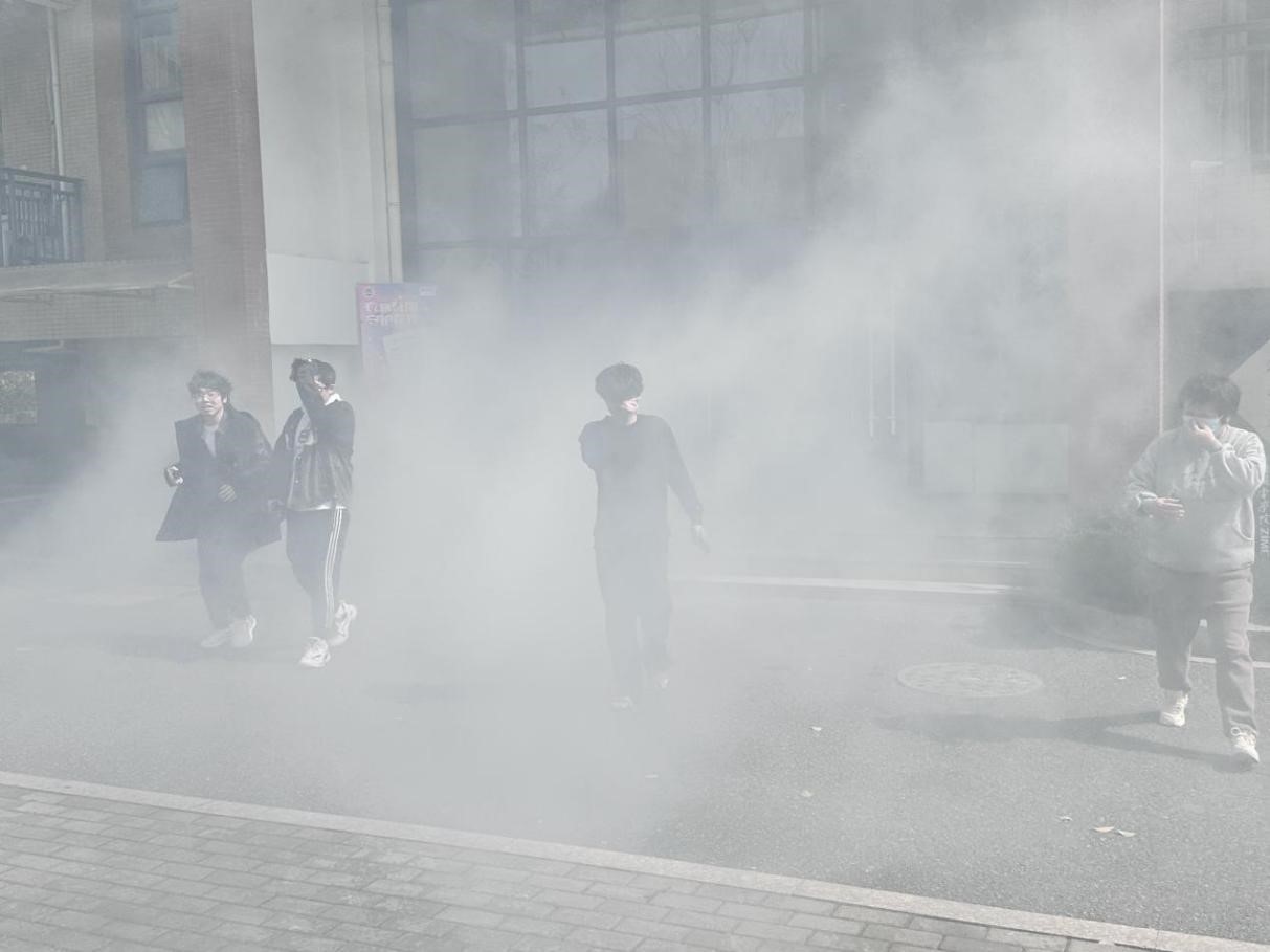 下午14:00时,消防疏散救援演练正式开始。急促的警铃响起,学生宿舍宿管员迅速查看、快速定位,发现宿舍已烟雾弥漫,火势失控,随后立即上报、开启应急广播、启动应急疏散预案,按照“安全第一、就近逃生”的疏散原则,引导楼内师生沿应急疏散安全路线快速撤离,等待救援力量赶往现场。