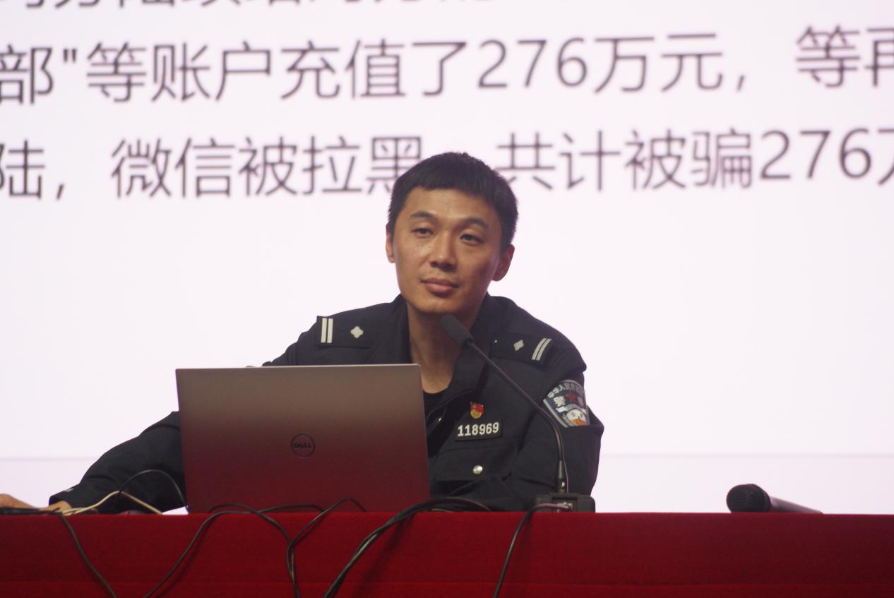 周一骁警官介绍了我国当前的反诈劝阻形势,并对目前常见的诈骗方式进行分析。同时,向同学们普及了电信诈骗的定义、识别方式和特点,用一个个真实案例、动画案例,深入浅出地为同学们介绍了各类电信诈骗的常见形式,包括网络交友诈骗、刷单诈骗、冒充公检法诈骗、网络贷款诈骗、网游诈骗和其他常见形式(如虚假购物诈骗、裸聊诈骗、机场改签诈骗、购买演唱会门票诈骗、注销校园贷诈骗等),让大家深刻认识到电信诈骗的危害性以及防范电信诈骗的重要性。