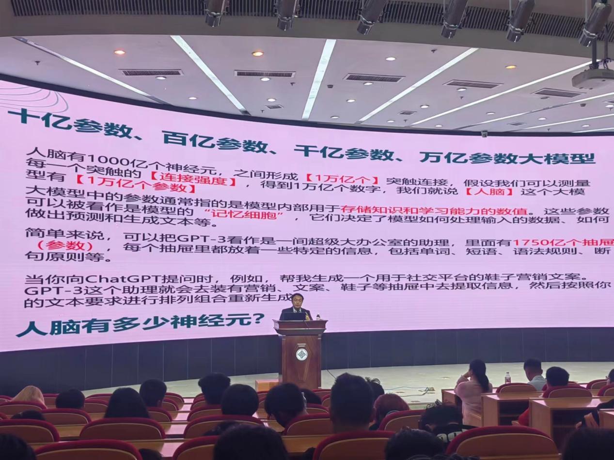张伟林向师生介绍了大模型的基本概念、核心技术与前沿发展。他以具体案例展示了大模型在语义理解、情感分析、问答系统、文本摘要等方面的精准建模能力,以及展现出的高度创新性和连贯性。
