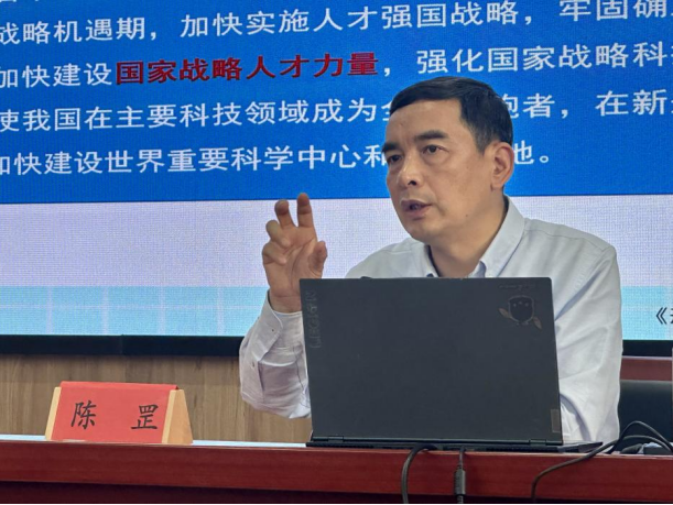 陈罡书记首先介绍了习近平总书记在中国共产党第二十次全国代表大会上所作的报告。报告指出,教育、科技、人才是全面建设社会主义现代化国家的基础性、战略性支撑。必须坚持科技是第一生产力、人才是第一资源、创新是第一动力,深入实施科教兴国战略、人才强国战略、创新驱动发展战略,开辟发展新领域新赛道,不断塑造发展新动能新优势。