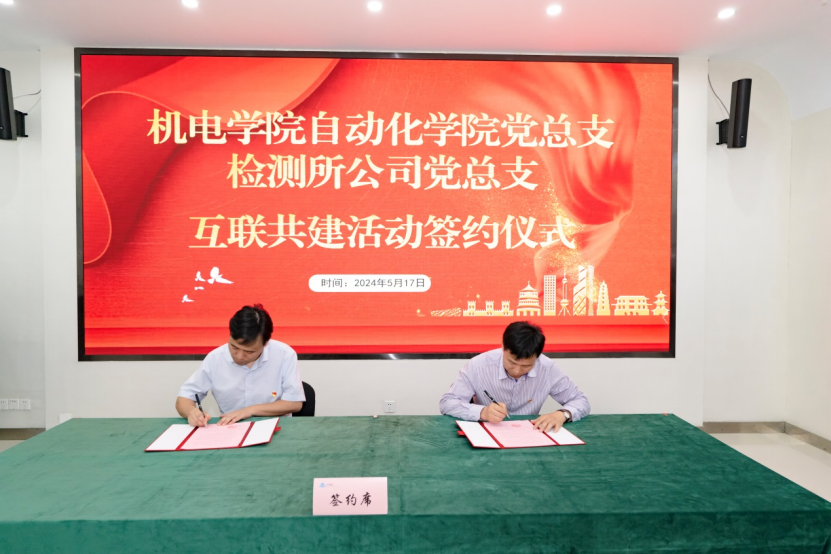 5月17日上午,浙江机电职业技术学院自动化学院党总支与浙江省机电产品质量检测所有限公司党总支互联共建活动签约仪式在省机电检测所公司滨江基地举行。自动化学院党总支副书记罗鹏举,公司党总支书记、董事长姜耀林,副总经理何朝辉,副总经理、党总支副书记盛英英及相关部门负责人、党员教师参加活动并座谈。