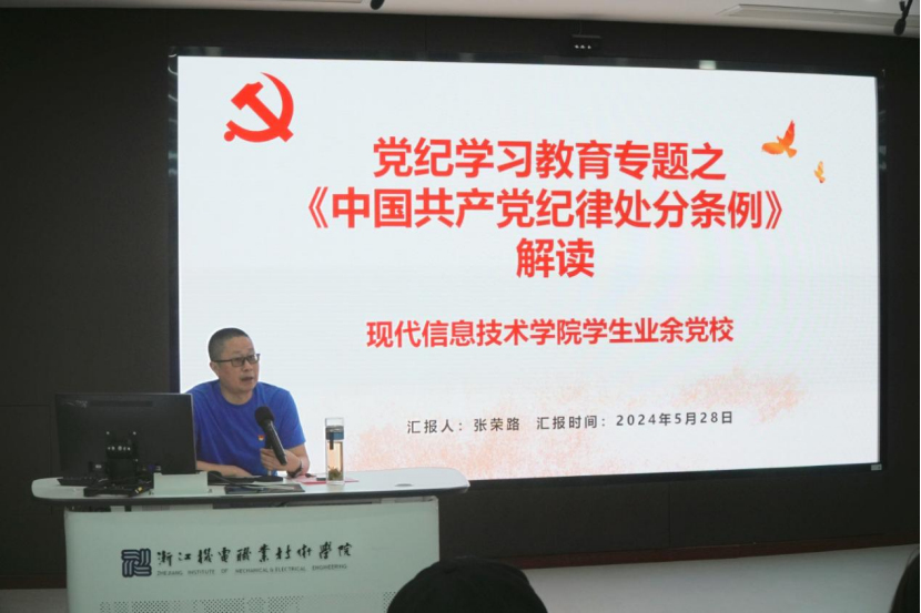 5月28日,现代信息技术学院党总支开展书记讲党纪学习教育专题党课活动,党总支书记张荣路领讲解读《中国共产党纪律处分条例》,学院第51期业余党校学员参加此次学习。