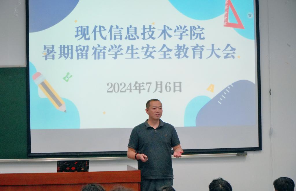 为深入贯彻落实学校中层干部大会精神和提出的要求,推进平安校园建设,助力创建5A大学,做好暑期留宿学生安全工作。2024年7月6日下午,现代信息技术学院在5号楼3号厅召开暑期留宿学生安全教育大会。