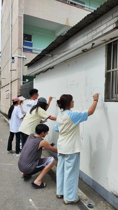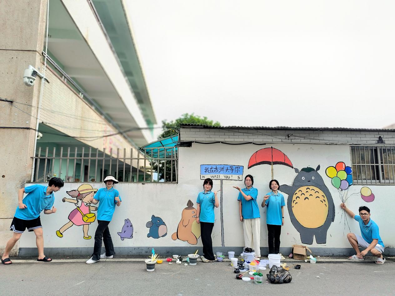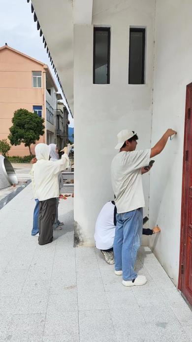 实践队充分发挥专业特长,以古渊头村的文化元素为灵感,将一幅幅充满创意和活力的墙绘作品描画在九曲巷、幼儿园等地墙面。滚烫的汗珠从额头划过,汗水浸湿了衣裳,队员们不怕苦不怕累,顶着烈日墙绘,充分展示了创设学子的良好精神风貌。