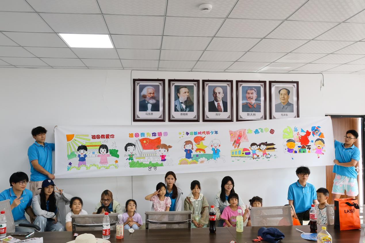 实践队还邀请古渊头村里的小朋友们共同参与了一场别开生面的绘画活动。这场活动的主题是“童心绘祖国,共献七彩梦”,旨在用实际行动庆祝新中国成立七十五周年。实践队的成员们与小朋友们一起挥毫泼墨,共同创作了一幅幅富有创意和内涵的画卷。这些画卷以祖国为主题,融入了小朋友们对祖国的热爱和对未来的憧憬,色彩鲜艳、图案生动,充满了童真和趣味。队员们不仅希望激发小朋友们对祖国的热爱之情,也希望通过他们的画笔和创意,为新中国成立七十五周年献上一份特别的礼物。