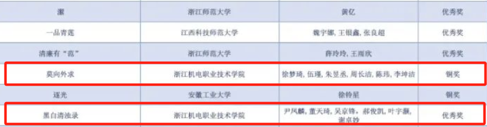 创意设计学院报送的三项作品《竹风——赋能校园清廉APP》《少年刘伯温现代游记——清廉书签摆件》《莫向外求》获得铜奖,另有《铁面无私炉》《黑白清浊录》两项作品获得优秀奖,成绩傲居全国高职院校第一。