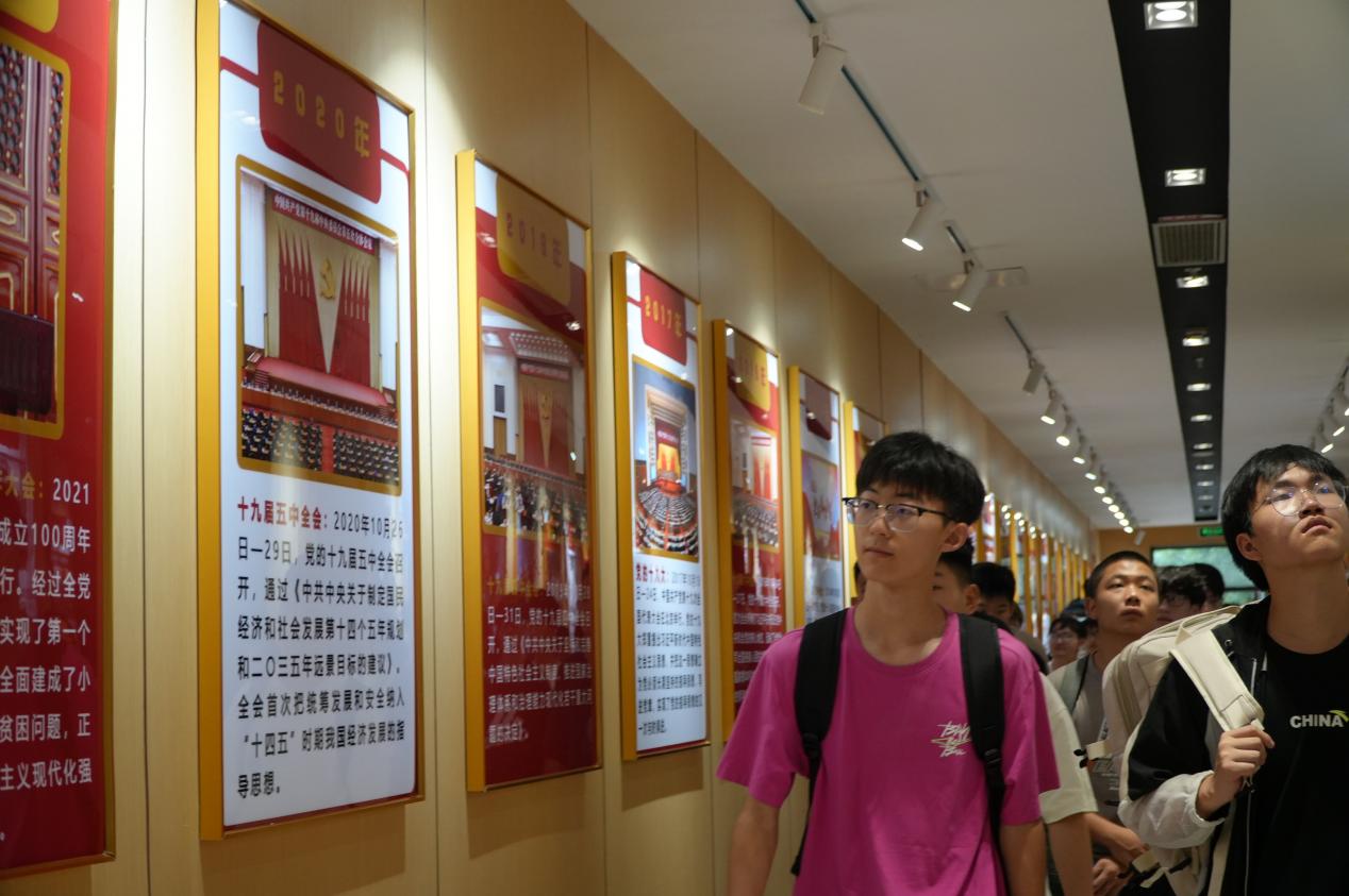 在马克思主义学院高瑞老师的带领下,现代信息技术学院新生们怀着崇敬的心情,驻足在一段段影像与图片展墙前,瞻仰党的光辉奋斗历程。