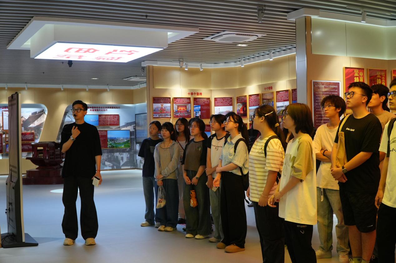 9月15日上午,马克思主义学院院长查广云教授带领现代信息技术学院2024级新生们走进学校“红色根脉”主题教育实践基地,为同学们带来了一场别开生面的党史学习教育体验课。查教授向同学们介绍基地建设的价值意蕴与宗旨理念;从红色信仰、红色历程、红色旗帜、红色沃土、红色基因、红色时空六大红色板块内容进行深入讲解;以图文实物、VR沉浸体验和视听展播等丰富形式,带给同学们深入学习党史知识、了解党的理论创新与实践发展成果的深刻体验。他勉励同学们,要时刻牢记习近平总书记嘱托,用党的光荣传统和优良作风坚定信念、凝聚力量,用党的实践创造和历史经验启迪智慧、砥砺品格,在伟大精神中汲取奋进力量。