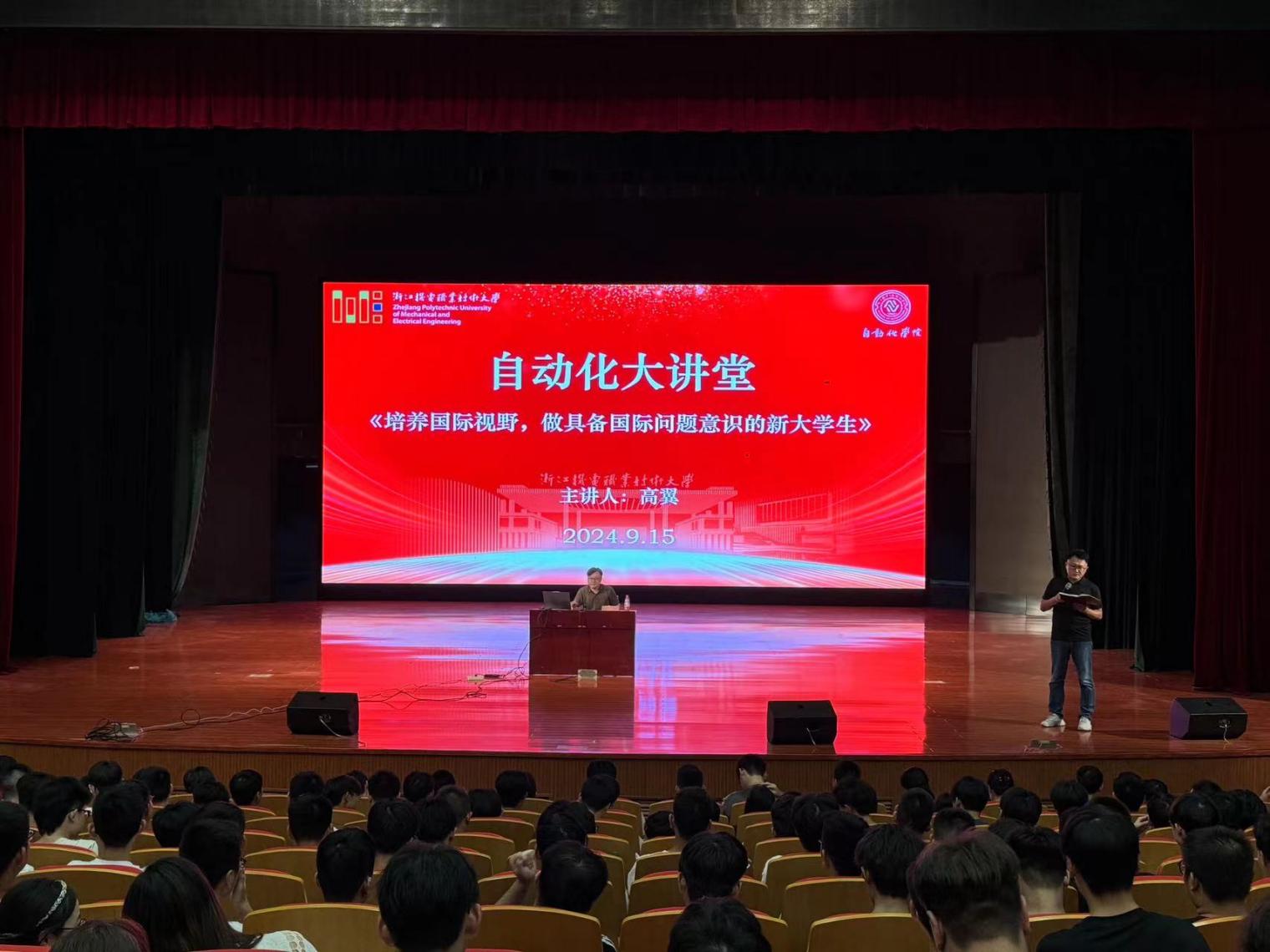 为促进学院师生适应日益开放的国际化趋势,增进国际化视野,9月15日晚,自动化学院在海宁校区小剧场举办了第五期“自动化大讲堂”,邀请到上海第二工业大学外语与文化传播学院高翼老师作主题为“培养国际视野,做具备国际问题意识的新大学生”的讲座。学院副院长王耀军出席讲座,学院辅导员、班主任、团学干部及2024级全体新生共同参加,讲座由学工办主任孟进主持。