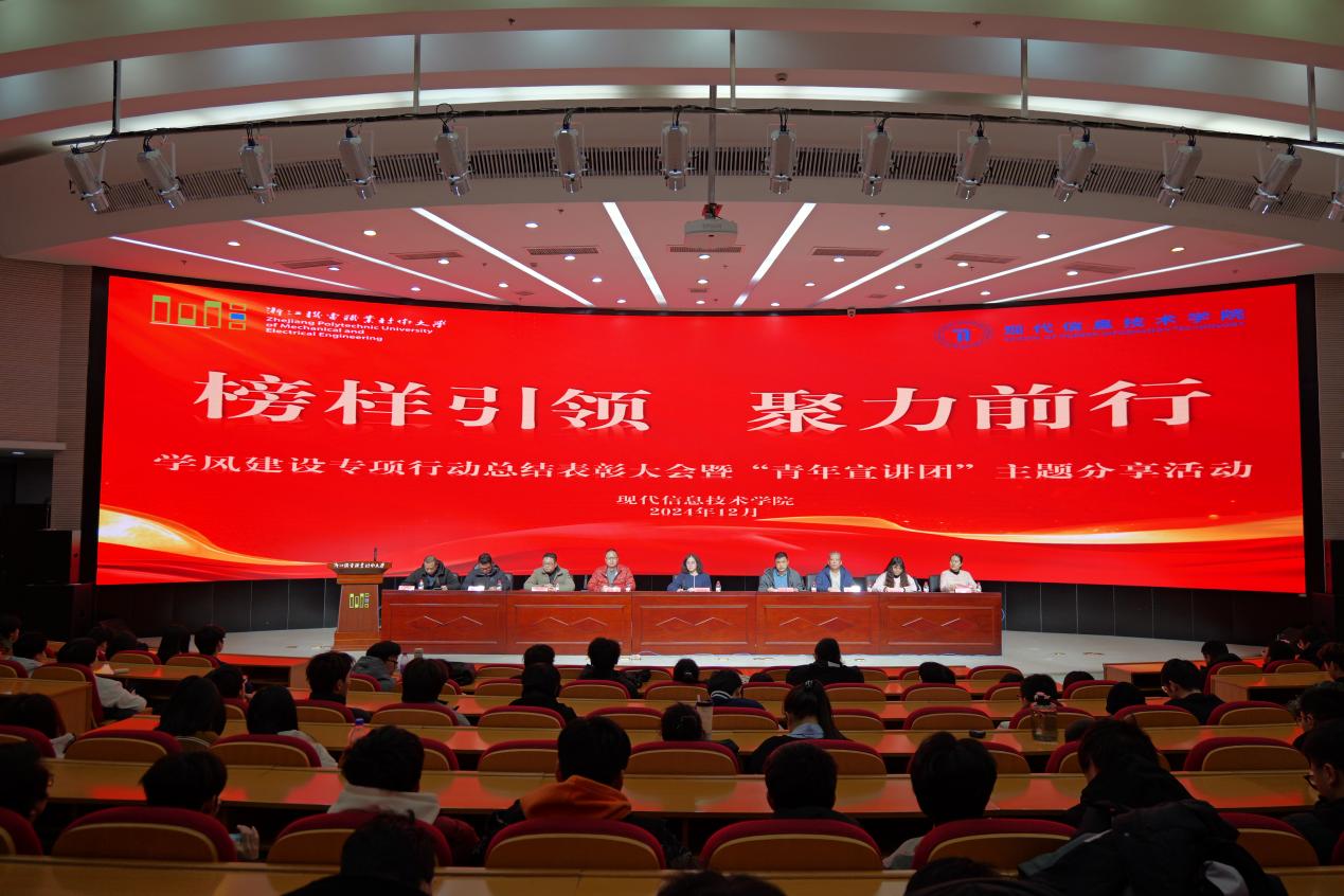 为深入学习贯彻党的二十届三中全会精神,落实立德树人根本任务,持续深化党建引领下学风内涵建设,12月26日,现代信息技术学院隆重举办2024年学风建设专项行动总结表彰大会暨“青年宣讲团”主题分享活动。校图书馆馆长周秀梅、现代信息技术学院领导班子全体成员出席大会,学院辅导员,获表彰代表、“青年宣讲团”成员及2024级全体学生参会。会议由学院学工办主任毋琦主持。