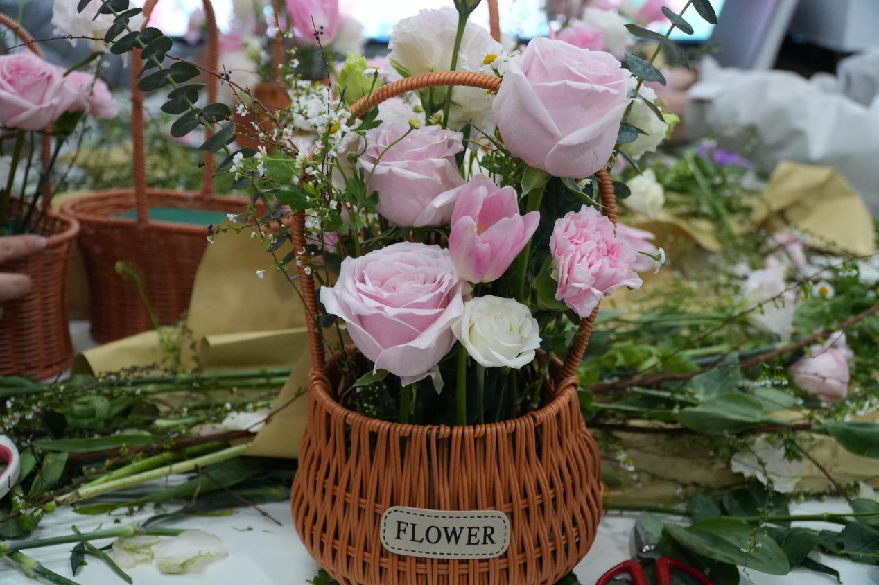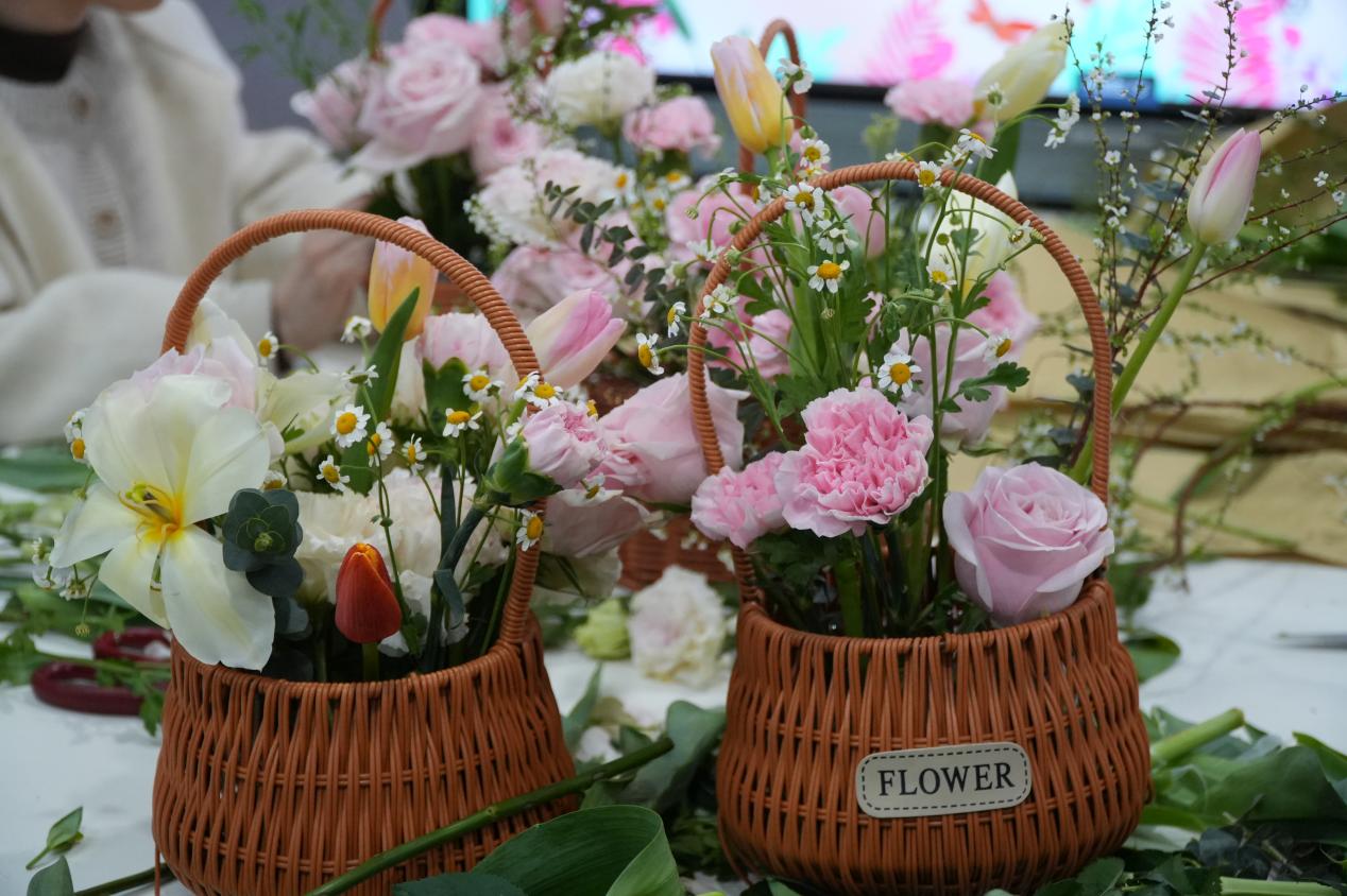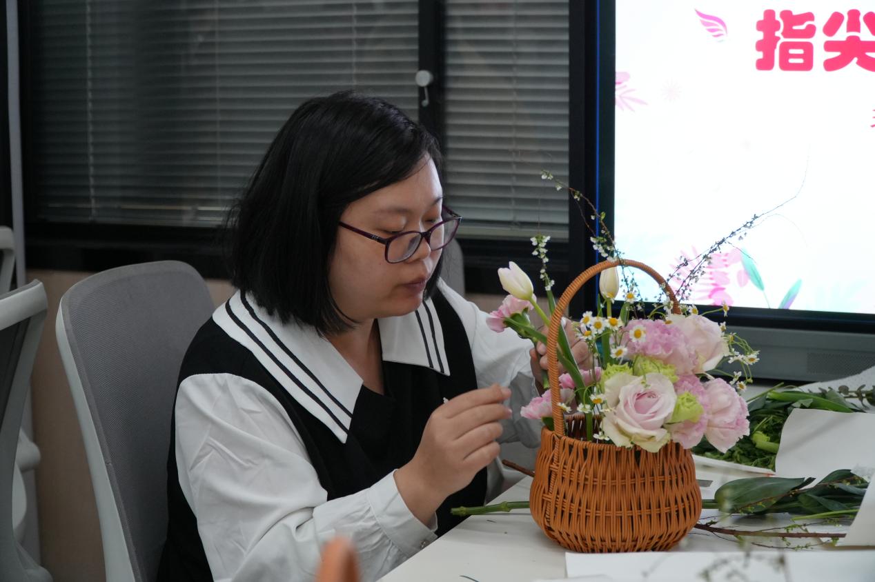 在“指尖花语”环节,参与者们迎来了自由创作的时刻。桌上摆满了各式各样的鲜花和绿植,从高雅的郁金香到娇嫩的粉荔枝、清新的粉佳人、温馨的康乃馨,再到活泼的小雏菊、飘逸的雪柳,每一种花卉都承载着独特的寓意和美好的祝福。特邀的资深花艺师现场指导,从花卉的选择、色彩的搭配到枝条的修剪,每一步都耐心讲解,让参与者们在轻松愉快的氛围中掌握了插花的基本技巧。