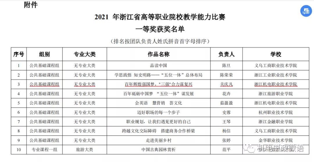 8月20日,2021年浙江省高职院校教学能力比赛在浙江金融职业学院落下帷幕,马克思主义学院关庆凡、董珊珊、王平平、范中健教学团队的《百年辉煌强国梦,“三 强”合力谋复兴》经过激烈角逐,荣获一等奖!