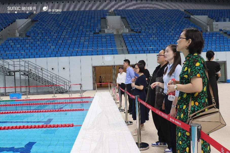 随后,国际教育学院一行在企业代表陪同下参观融创服务的杭州国际博览中心、杭州亚运会体育馆、游泳馆等。