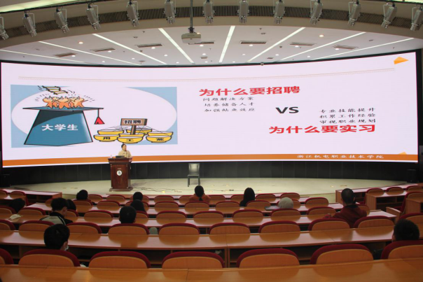 现代信息技术学院于11月8日晚在综合楼4号报告厅组织开展以“HR视角谈面试” 为主题的HR进校园讲座活动,提升学生了解面试技巧,获知企业人才需求,增强学生社会竞争力。讲座特邀浙江红相科技股份有限公司HR黄子蓁女士主讲。产学办主任梁启来、学工办主任毋琦、团学干部、及大三各班代表学生参加此次讲座。