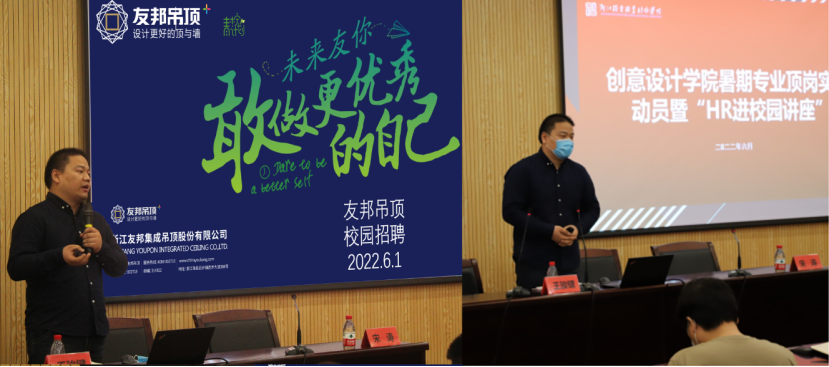 第二部分为“HR进校园”讲座,由友邦集团吊顶股份有限公司人力资源经理王骏健进行招聘相关事项的介绍,主要介绍此公司相关文化以及同学走上工作岗位后公司需要我们做什么等相关问题,公司希望用一种相对开放的模式、开放的风格、开放的文化接受全新的创新设计思路。