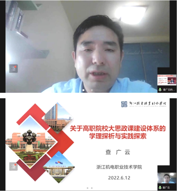 学校马克思主义学院院长、党总支书记查广云教授当选全国职业院校“大思政课”建设创新联盟副理事长,并做了题为《关于高职院校“大思政课”建设体系创新的学理探析与实践探索》的精彩专题发言。查教授从“大思政课”的科学内涵、“大思政课”建设体系的学理逻辑、“大思政课”建设体系的政策逻辑等三个层面就高职院校“大思政课”建设的学理和政理支撑做了简要阐述;从“史实一体”、“理实一体”、“虚实一体”三个方面,就我校马克思主义学院探索构建“三实一体”大思政课实践教学体系做了具体分析,受到与会者好评和较好反响。