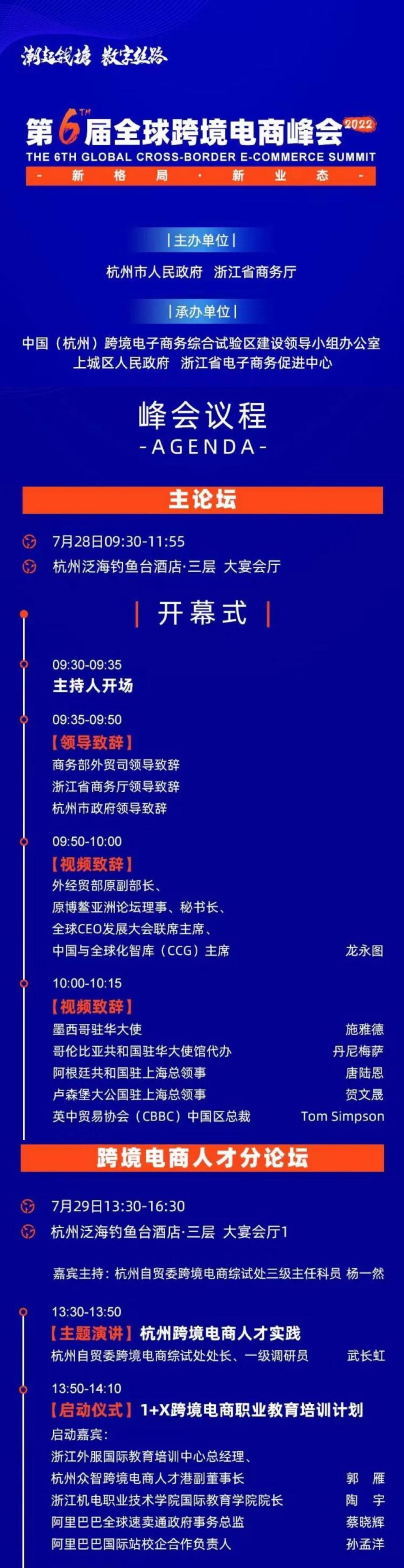 2022年7月28-29日,由浙江省商务厅、杭州市政府主办的2022全球跨境电商人才论坛在杭州召开。会议邀请外经贸原副部长、全球CEO发展大会联席主席、中国与全球化智库(CCG)主席龙永图,墨西哥、哥伦比亚驻华大使,阿根廷和卢森堡驻上海总领事,英中贸易协会中国区总裁,阿里巴巴、亚马逊、Shopify、资本投资公司、跨境电商企业及高校等采用视频或现场的方式参会。会议讨论在RCEP协定生效,DTC模式崛起,数字生态创新,品牌全球化驶入快车道的新形势下,如何以全球视野,见跨境“杭”向,构建跨境电商生态圈,并设创新与发展、DTC品牌独立站、品牌出海、人才培养等分论坛。