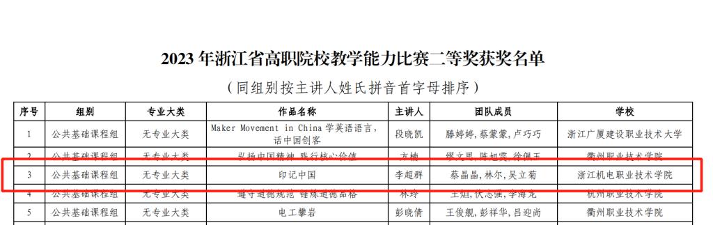 7月30日,2023年浙江省高职院校教学能力比赛在金华职业技术学院落下帷幕,我院对外汉语教研室李超群、蔡晶晶、林尔、吴立菊教师团队的参赛作品《印记中国》荣获二等奖。