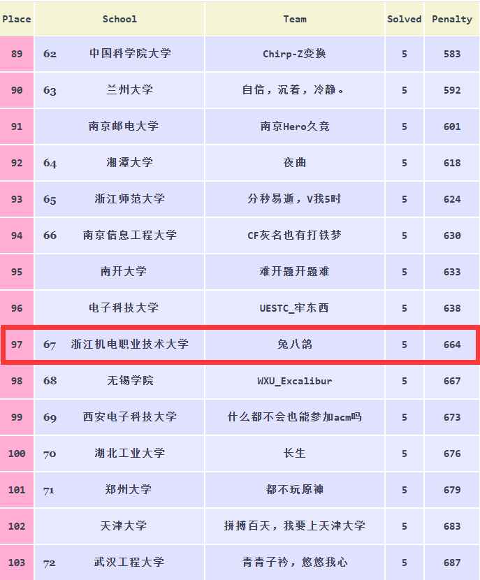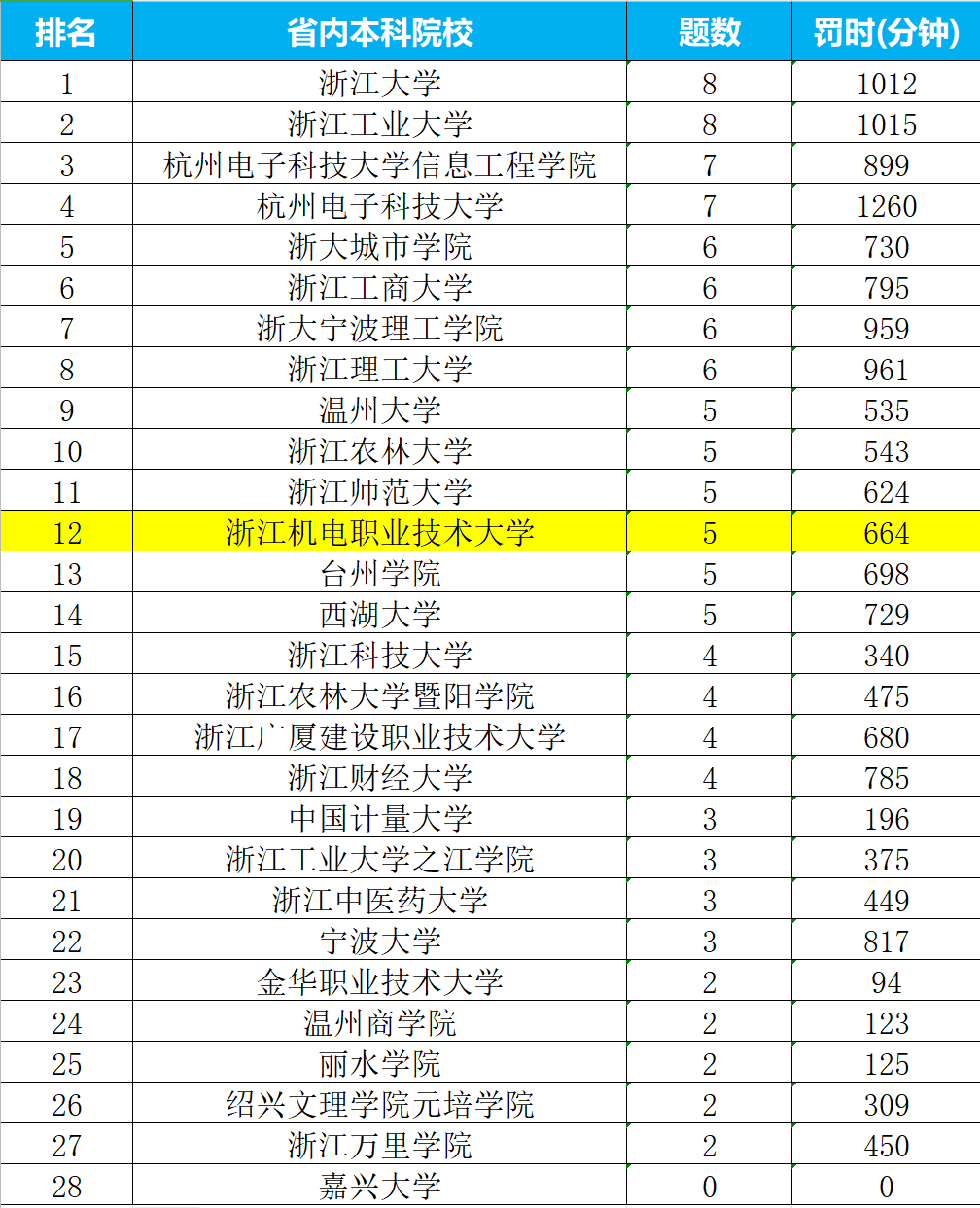 本次比赛由杭州师范大学和浙江大学联合承办,共有来自全国231所高校、366支队伍入围现场赛,其中本科队伍360支,专科队伍6支,参赛院校覆盖了清北复交、双一流、211高校等在内的几乎国内所有ACM竞赛强校,竞争激烈。经过5个小时的鏖战,我校“兔八鸽”战队(参赛队员:应程杰、林宇曈、洪志伦)稳打稳扎,发挥稳健,以队伍排名97名,院校排名67名的优异成绩,书写了职业本科院校参加传统竞赛的新历史!