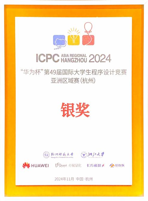 11月10日,第49届ICPC国际大学生程序设计竞赛亚洲区域赛(杭州站)比赛在杭州师范大学叔同剧院落下帷幕。我校邹会来、张宪乐两位老师指导的战队“兔八鸽”发挥出色,创造历史,喜获一枚银牌!这是我校自2003年参加程序设计竞赛以来的第一块ICPC区域赛银牌,也是全国职业本科院校参加ICPC区域赛现场赛有史以来的第一块银牌!