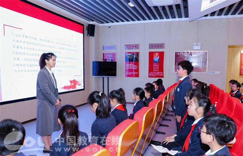 在筑牢"红色根脉"主题教育实践基地,机电大学王平平老师与钱江湾小学芮甜甜老师开展"双师同堂"教学: