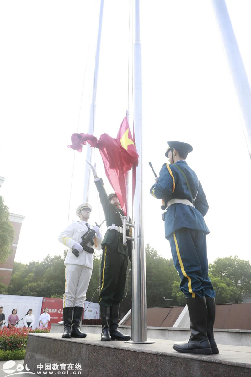 英姿飒爽的国旗护卫队队员们身着海陆空军装伫立在升旗台前,他们昂首挺胸,护卫着国旗,迎着朝阳,迈着整齐的步伐走向升旗台。伴随着雄壮的《义勇军进行曲》响起,活动进入第一个环节,升旗仪式。全体在场师生庄严肃穆,凝视着鲜艳的五星红旗冉冉升起。