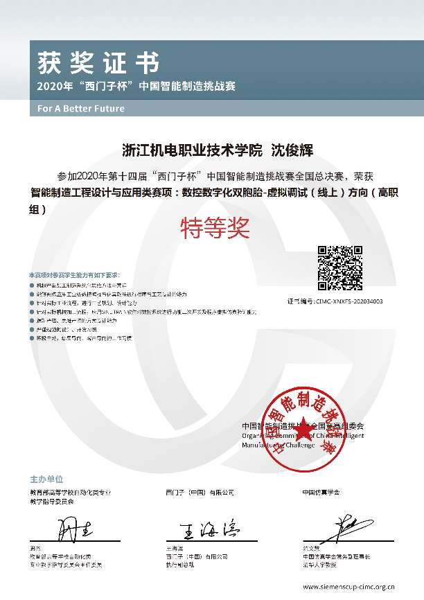 近日,第14届“西门子杯”中国智能制造挑战赛全国总决赛在线上举行,浙江机电职业技术学院智能制造学院学子勇创佳绩,获得“数控数字化双胞胎--虚拟调试”赛项国家特等奖1项、一等奖1项。