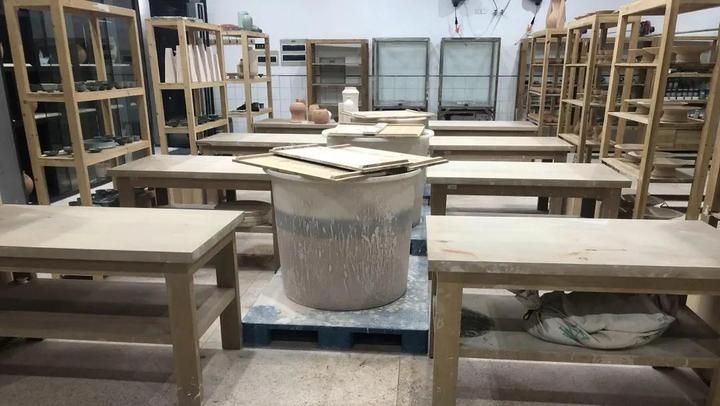 手作室间,配有86寸交互式智能平板、拉坯机、泥板机、练泥机等专业陶瓷设备,并可同时对72名学生开展手工捏塑、泥条盘筑、泥板成型、手工拉坯、印模成型、注浆成型和坯体印花、刻花、划花、镂空、贴花、剔花等成型与装饰手法教学。