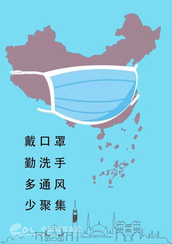作品说明:中国地图和城市为背景,全图蓝色调。代表只有全国人民携起手来,共同努力,人人戴好口罩,做好预防措施,中国才会迎来美好的蓝天白云。