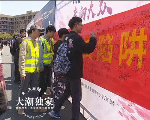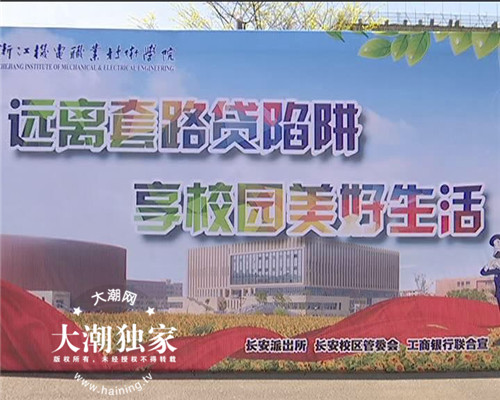 4月1日中午,在浙江机电职业技术学院长安校区南广场和食堂门口,海宁长安派出所联合机电学院开展了“远离套路贷陷阱、享校园美好生活”宣传活动。活动现场,志愿者分发宣传资料,广大学生在横幅上集体签名,长安派出所镇区警长陈力在向学生们讲解套路贷的陷阱。