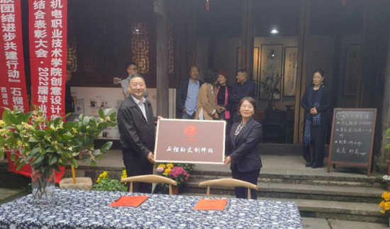 随后,邓劲莲委员代表学院与张志来主任签署石榴籽文创驿站合作协议,并进行了石榴籽文创驿站授牌仪式及产学研合作基地授牌仪式,参会所有师生与参会嘉宾合影留念。