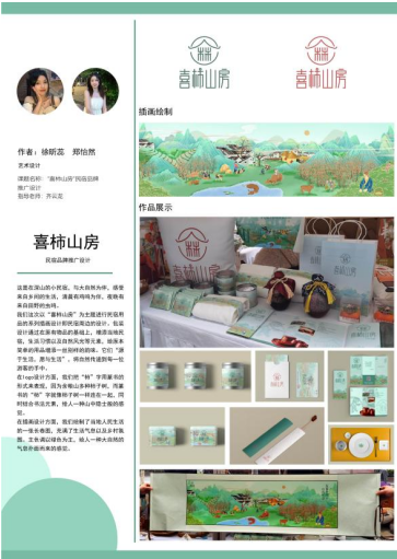 余粮山村以特色产品大红柿子而闻名。在老师们的指导下,同学们组建了创作小分队,深入余粮山村实地考察,策划设计推广乡村品牌、民宿品牌、特产品牌、品牌IP形象。齐云龙老师组以某民宿为选题,对民宿用品进行设计。这座民宿坐落于深山,与大自然为伴,四处都有柿子树。秉持“源于生活,愿与生活”的理念,同学们以“喜柿山房”为主题,将生活习惯、自然风光等元素进行设计后添加在民宿原有物品上。徐昕蕊同学说:“在logo设计方面,我们把‘柿’字用篆书的形式来表现,篆书的‘柿’字就像柿子树一样连在一起,给人一种山中隐士般的感觉。”郑怡然同学说:“在插画设计方面,我们绘制了余粮山村人民生活的一张长卷图,主色调以绿色为主,给人一种大自然的气息扑面而来的感觉。”