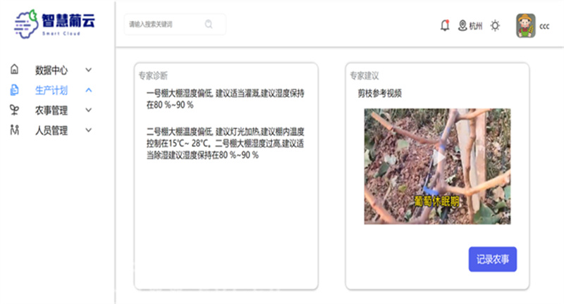 记者了解到,智慧葡云管理系统是一款致力于提升农业数字化管理、深度融合先进的农业技术与信息技术。它是专为葡萄种植户量身打造的全面智能化管理工具,旨在为种植户提供一站式的葡萄种植解决方案,从而助力其实现高效、精准的葡萄园管理。核心功能涵盖全方位的农事指导、详尽的农事记录、实时的大棚温湿度监控以及高清的视频播放等多元化服务。从葡萄的种植初期到硕果累累的收获季节,系统都能为农户提供科学、细致的农事操作建议,确保每一颗葡萄都能得到最优呵护。