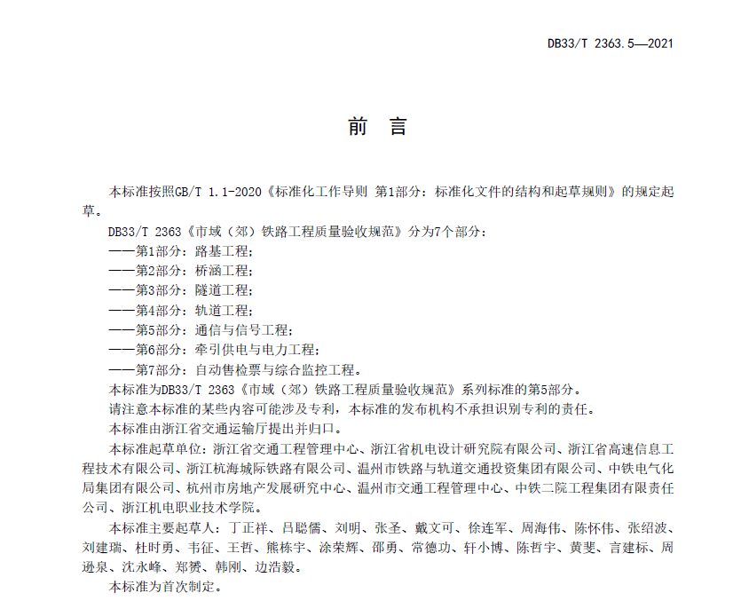 近期,浙江省市场监管局批准发布DB33/T2363《市域(郊)铁路工程质量验收规范》省级地方标准,标准全文发布于浙江省地方标准网,该《规范》是我国首个市域(郊)铁路工程质量验收地方标准,丰富和发展了铁路技术标准体系。