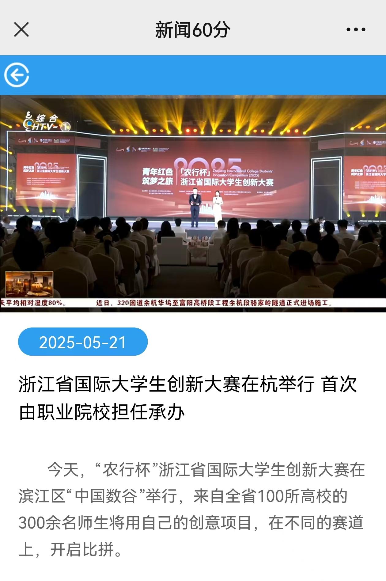 为深入贯彻落实习近平总书记给中国国际大学生创新大赛参赛学生代表的重要回信和给大赛“青年红色筑梦之旅”大学生重要回信精神,引导青年学子扎根中国大地,在传承红色基因中筑牢信仰根基,在服务国家战略中贡献青春力量,用创新创业的生动实践奋力谱写中国式现代化浙江新篇,5月21日下午,“农行杯”浙江省国际大学生创新大赛(2025)“青年红色筑梦之旅”启动活动在杭州市滨江区“中国数谷”举行。活动由浙江省教育厅、共青团...