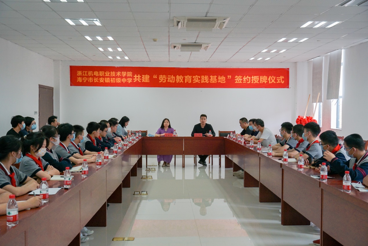 为进一步贯彻落实“五育并举”育人理念,发挥实施素质教育劳动基地的作用,为大学生社会实践活动和中学生劳动教育提供平台,浙江机电职业技术学院与海宁市长安镇初级中学本着共享共赢原则,互设“劳动教育基地”。5月25日下午,签约、揭牌仪式在我校海宁校区举行。浙江机电职业技术学院学生处副处长方惠玲,长安镇初级中学校长夏云熙、副校长徐玉清出席本次签约仪式,长安镇初级中学“创梦时代”社团成员和我校劳模培育班学生代...