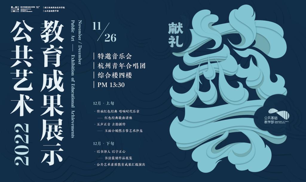 —— 金秋时节 硕果累累 ——我校公共基础教学部筹备了多场公共艺术教育成果展示活动自11月26日起至12月31日公共艺术教研室将举办以下系列美育活动将2022年度美育教学成果献礼这个特别的秋季 “高雅艺术进校园” 杭州青年合唱团特邀音乐会 “传承红色经典 唱响时代乐章” 红色经典歌曲讲座 “五声正音 古韵新传“ 古筝流行金曲赏析沙龙 “以书泽人 以字正心” 书法篆刻作品展览 公共艺术素质教育成果汇报演出 2022公共艺...