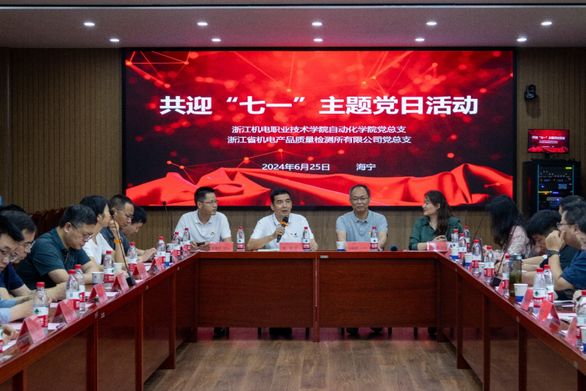 在庆祝中国共产党诞生纪念日之际,为进一步加强校企合作,促进资源共享与人才培养,6月25日,浙江机电职业技术学院自动化学院党总支与浙江省机电产品质量检测所有限公司党总支联合举办了以“共迎‘七一’”为主题的主题党日活动。自动化学院党总支书记陈罡,副院长王耀军,公司副总经理何朝辉,副总经理、党总支副书记盛英英,及相关部门负责人、党支部书记、党员教师代表参加活动并座谈。座谈会上,双方围绕党建共建共创、专业...