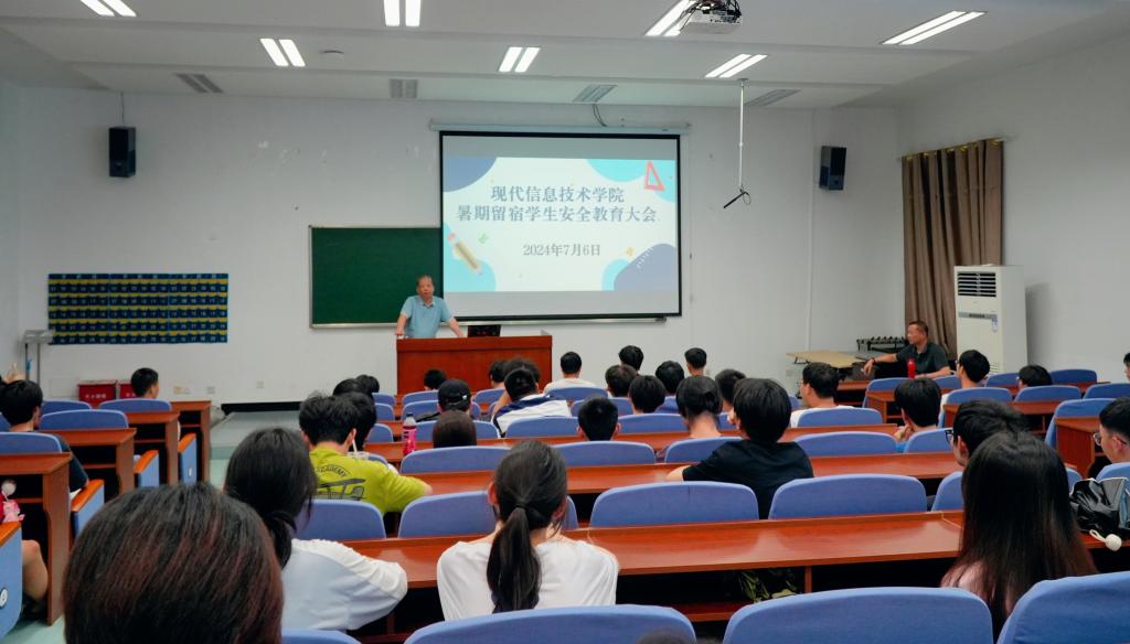为深入贯彻落实学校中层干部大会精神和提出的要求,推进平安校园建设,助力创建5A大学,做好暑期留宿学生安全工作。2024年7月6日下午,现代信息技术学院在5号楼3号厅召开暑期留宿学生安全教育大会。学院党总支副书记朱爱民针对暑期留宿学生初期的综合表现做了简要回顾,并就暑期留宿学生安全工作向留宿同学提出要求:一要珍惜学习机会,要有紧迫感,拟定学习计划,合理安排作息时间,夯实专业知识,做好职业规划;二要增强安全...